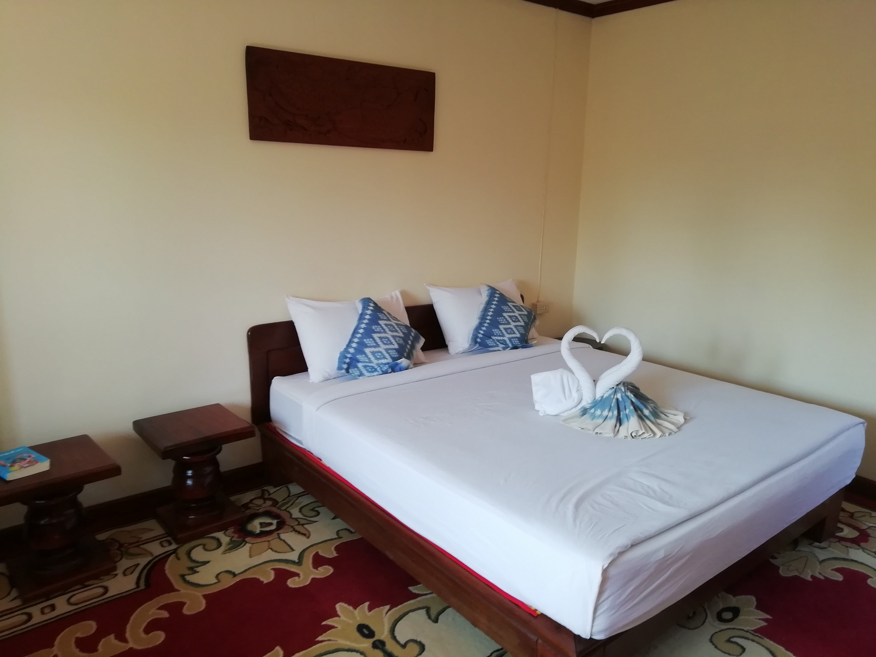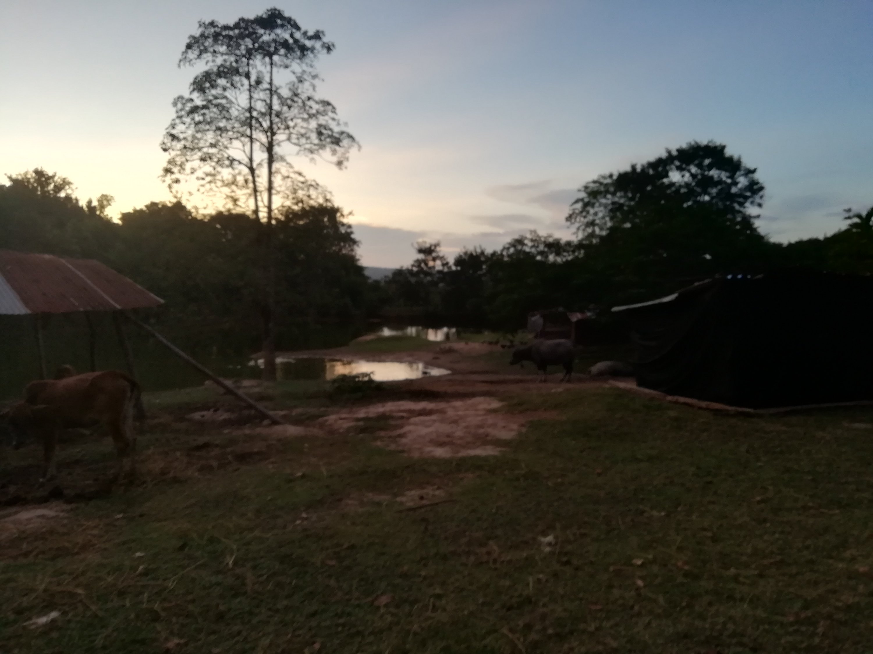 Vi brukte 2 timer ut av byen og var ganske øre i toppen når vi endelig nådde landeveien. Audun brant leggen sin på potta i tillegg til å være klar for middag, så kl 16. 30 begynte vi å se etter en ok plass å spise (vi hadde gått over streetfood grensa). Plutselig midt ute i jungelen så vi en byggeplass til et nytt tempel, men ved siden av sto det restaurant og resort. Vi tenkte her kan vi sikkert spise, men når vi kom litt nærmere så fant vi ut at her vil vi sove og, vi har jo tross alt tilbakelagt mange nok mil på sykkel i dag… Trodde vi.. Etter en nærmere sjekk på Google så vi at vi har kjørt hele 6,5 mil på 5,5 time… Jaja, er man på tur så er man på tur, her er det ihvertfall kjempe fint! En flott resort som nå ligger litt i dvale på grunn av lite trafikk, med kuer, geiter, høner, gjess, vannbøfler og en katt. Rommene bærer preg av å ikke ha blitt vasket på en god stund, men det tåler vi.
