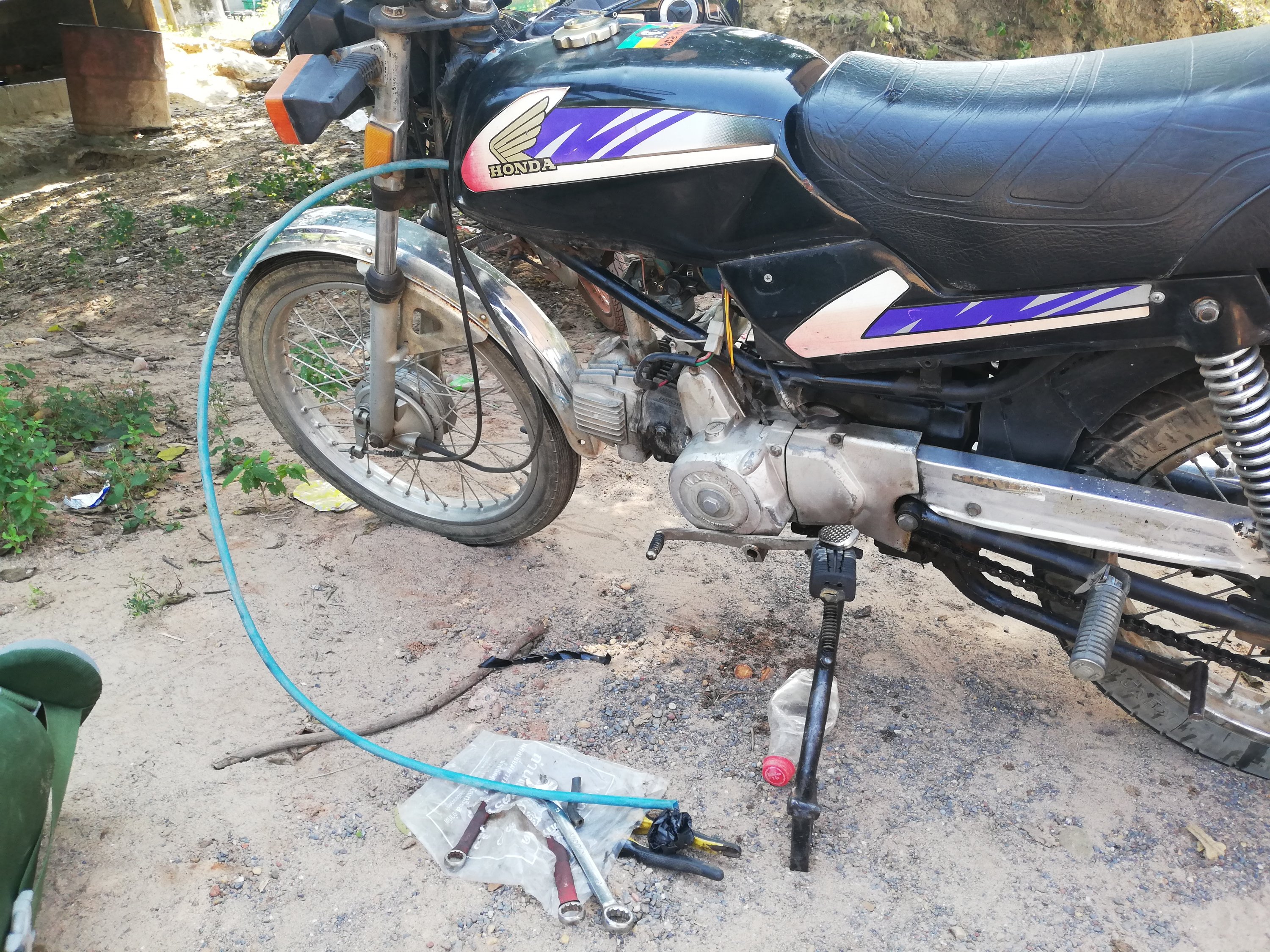Så med Rune på toppen så skulle jeg bare kjøre Bob opp… Note to my self:hvis du tenker skal bare, så don’t! Jeg har ikke kjørt Bob før og med 35kg bagasje og Ida bak meg så klarte jeg ikke å holde Bob på hjula og vi deisa i bakken alle tre! Bensin spruta ut av sykkelen og jeg fikk hjelp av Ida til å få han raskt på hjula igjen og ut i kanten. Ida var uskadd, takk gud! Jeg har litt skrubbsår på beina, men ikke noe farlig. Bob fortsatte å blø kraftig, bensinkrana var knekt av. Vi begynte etterhvert å fylle flasker med bensin som rant ut, det er nok av tomflasker i veikanten. Etterhvert fikk vi dytta Bob opp bakken og der var det noen matboder, jeg spurte om hjelp og da gikk damene bak veggen og henta en mann, de er her, men de ligger stort sett på en feltseng eller i en hengekøye mens damene jobber.. Mannen var veldig hjelpsom og henta først verktøy og senere flytende metall for å tette lekkasjen.
