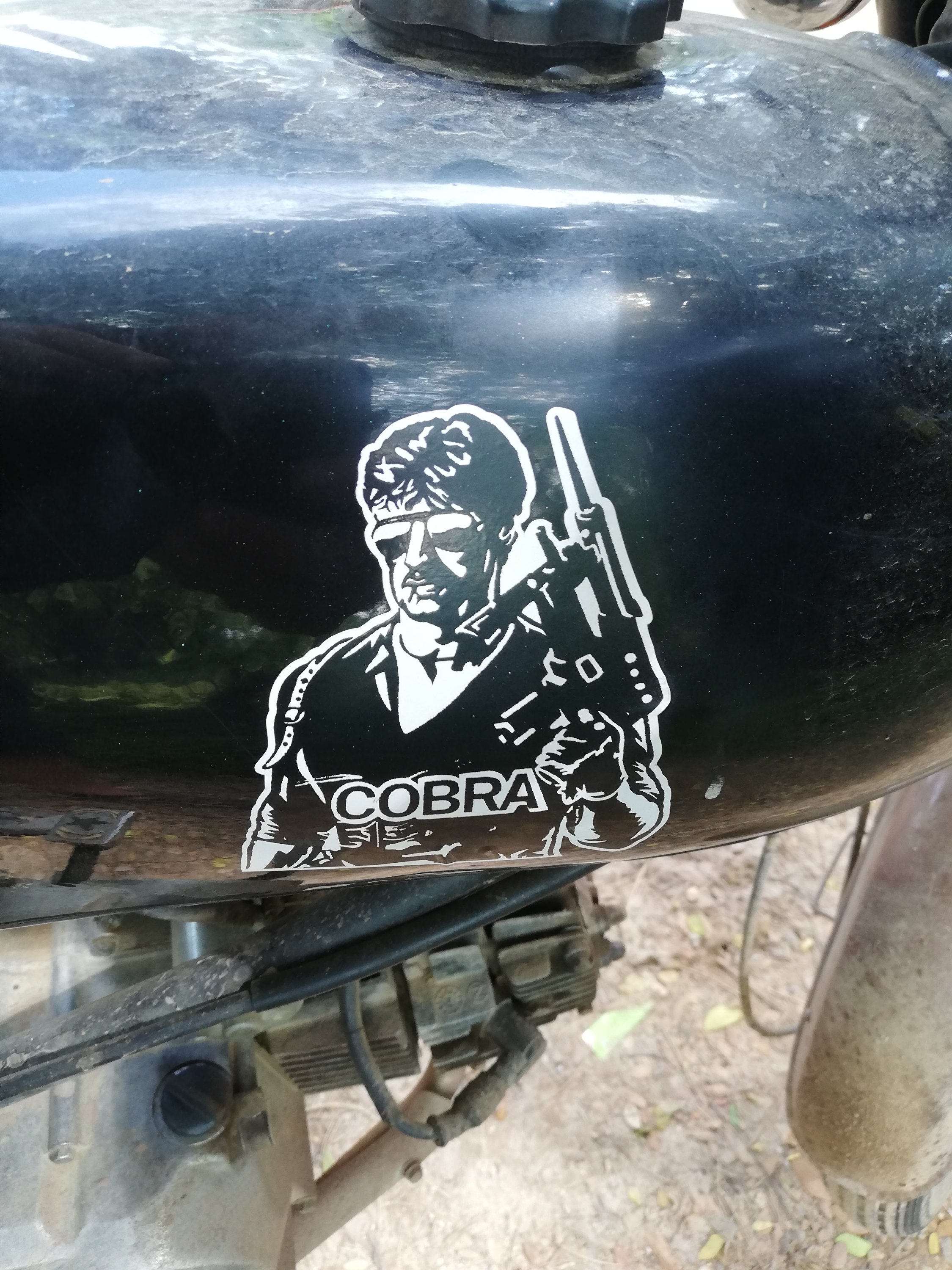 Fredag. Gleden var stor da klokka ble 7 og jeg kunne pakke og forlate mine nye ” venner”. Dro til nærmeste motorsykkel verksted for å få på nye speil, nytt framdekk, bytte olje og plugg. Fikk gjort alt, unntatt framhjulet, noe ukurant dimensjon, de forsto heller ikke hvorfor jeg ville bytte det, var jo luft i det. Dette kostet 55kr, noe jeg syntes var rett rimelig, så jeg kostet på meg ett klistremerke av Cobra for 3 kroner. ( Klassiker av Sylvester Stallone).