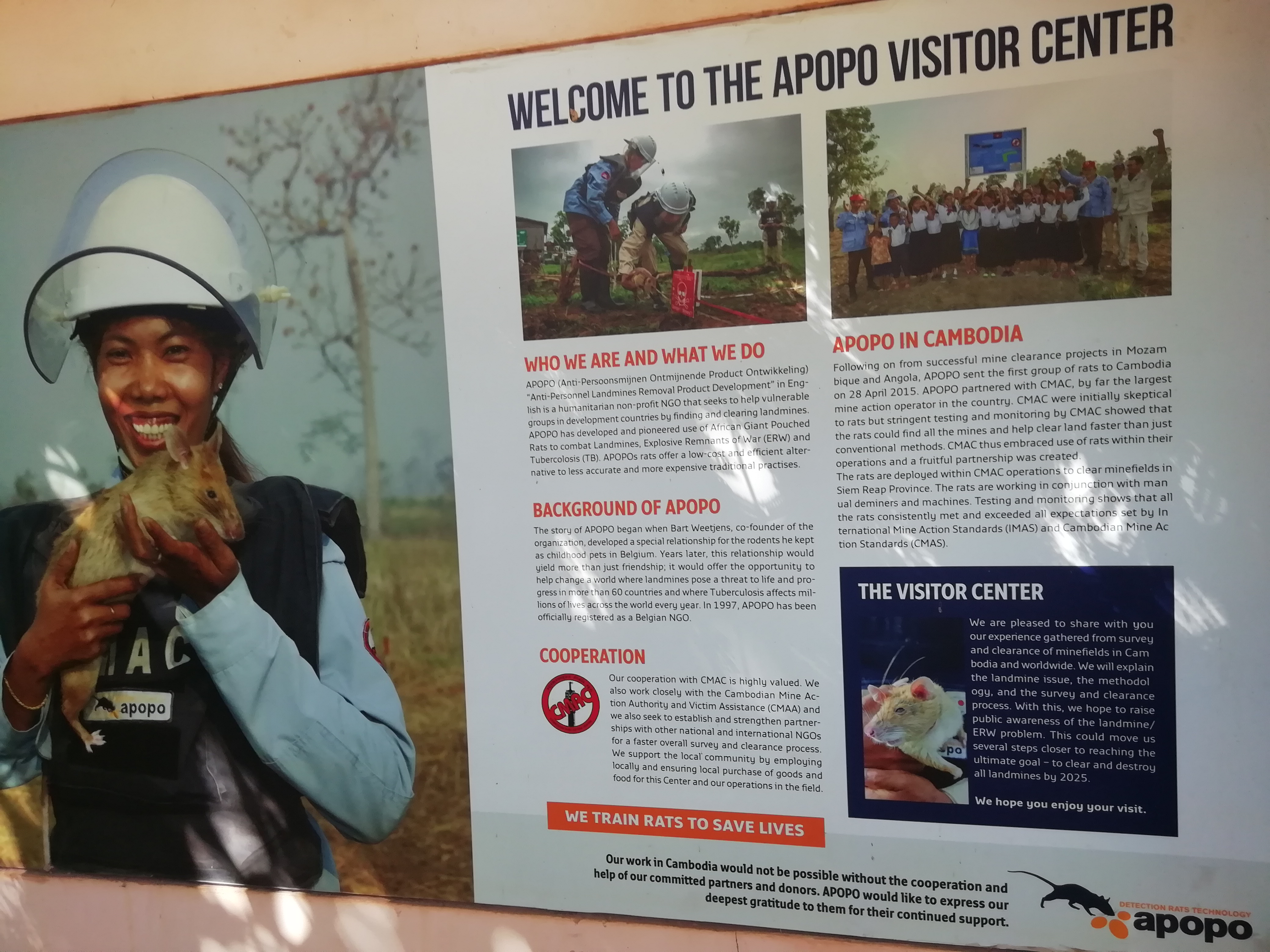 Kambodsja er det landet i verden med mest landminer og hvert år skades et stort antall mennesker av disse, bare i fjor var det 81 amputasjoner på grunn av landminer her i landet. Rottene er 3 ganger så effektive til å lokalisere miner som andre metoder. Vi fikk en demonstrasjon og det var virkelig fascinerende hvordan de jobber.