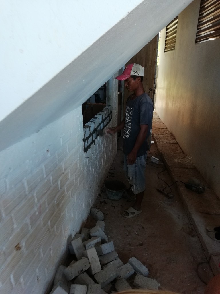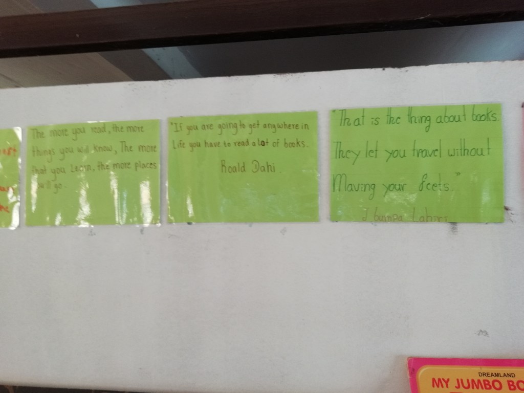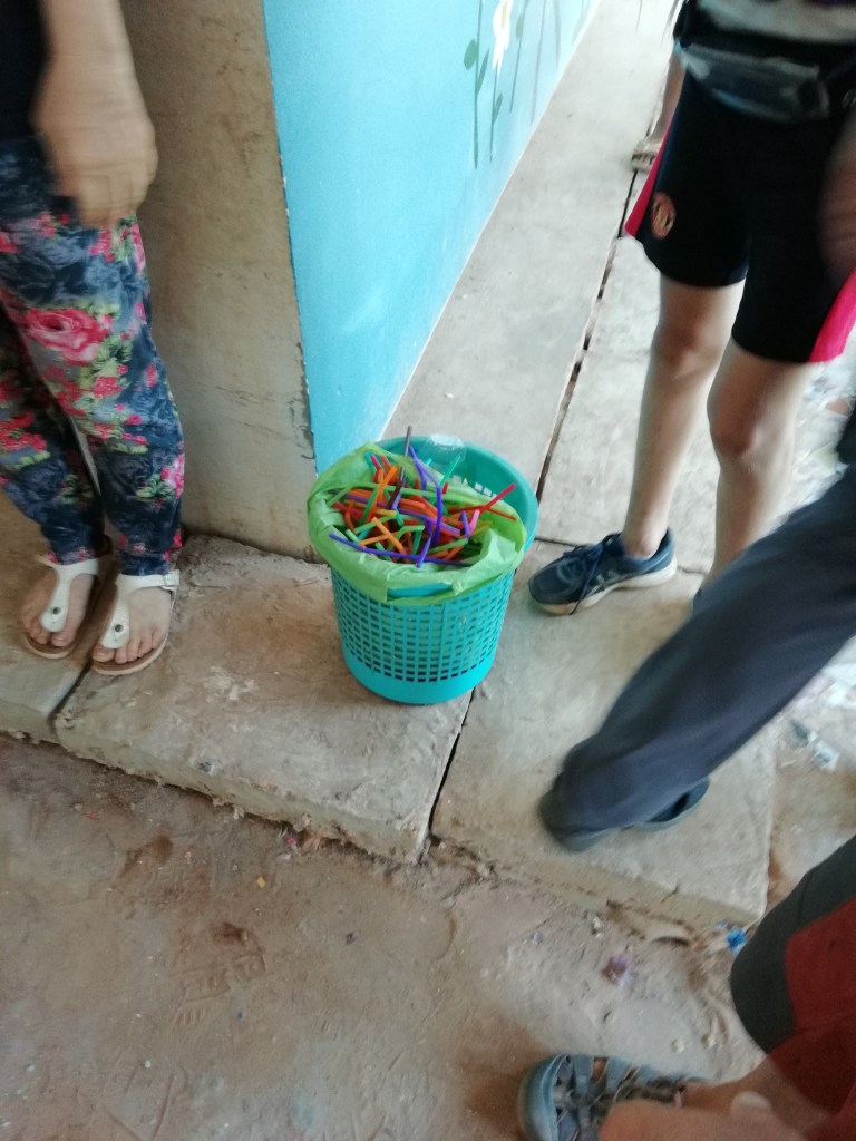 Hele skolen er bygget med mursteiner som inneholder plastavfall, mur/plast-steinene lager de selv. Orginal gjenvinning!