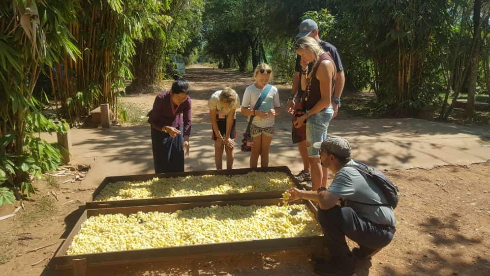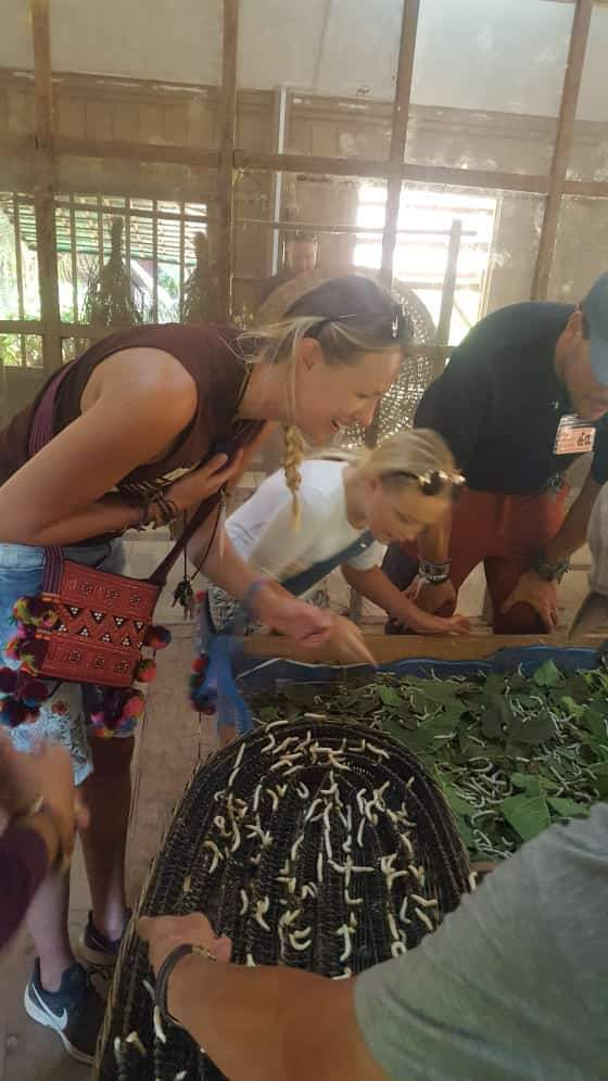 Fordelen med motorsykkel er at vi ikke trenger å planlegge alt, så i dag bestemte vi oss for å dra å se hvordan de lager silke. Endelig litt motorsykkel kjøring igjen! Ida var helt på gråten når vi kom frem til silkegården, vi kan ikke selge Cobra mamma, vi må sende han hjem. Så selv om barna har vært lei timer på sykkelen så ser de nå hvor mye moro vi har med de.