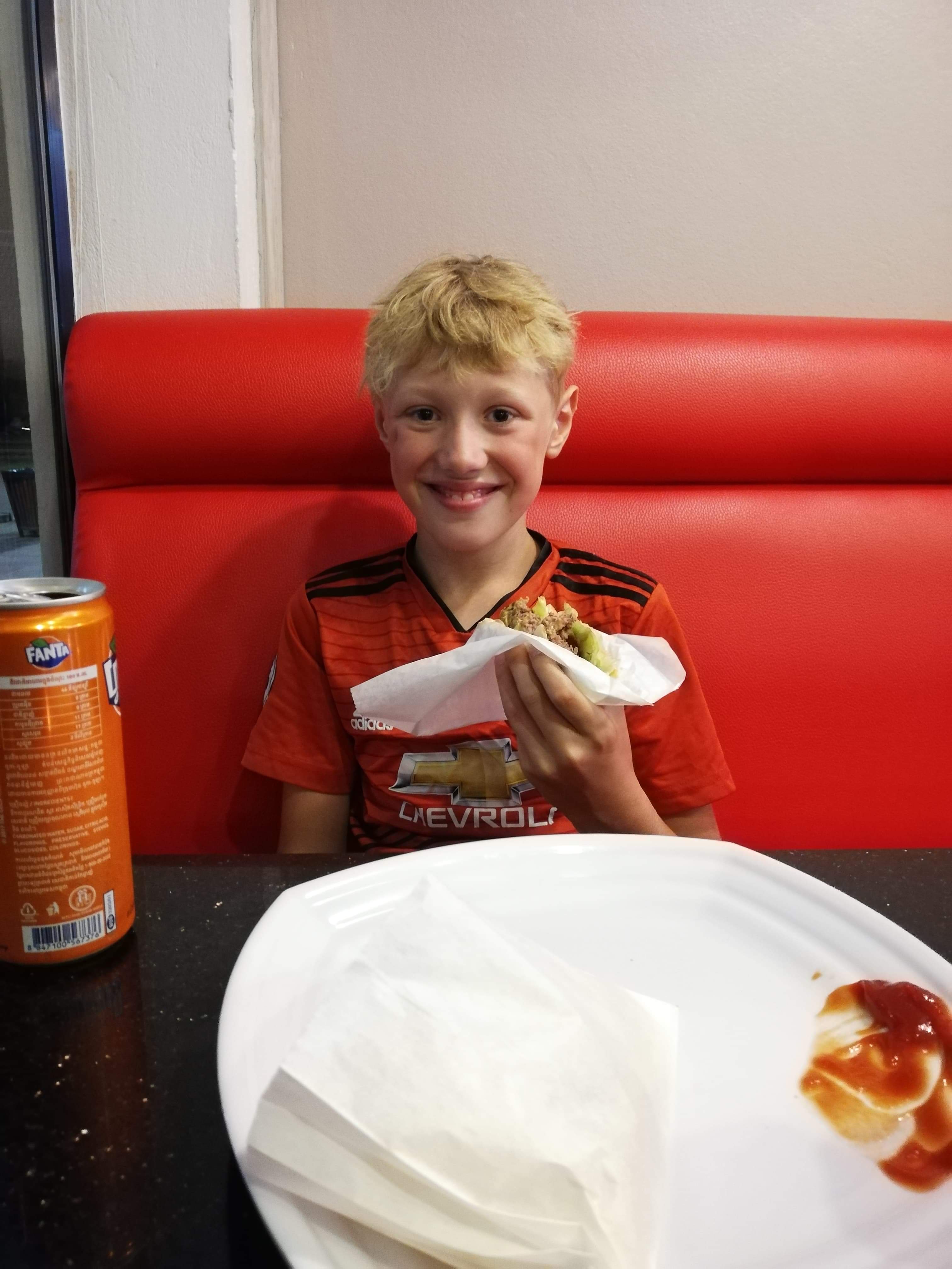 Lykkelig over å få hamburger.